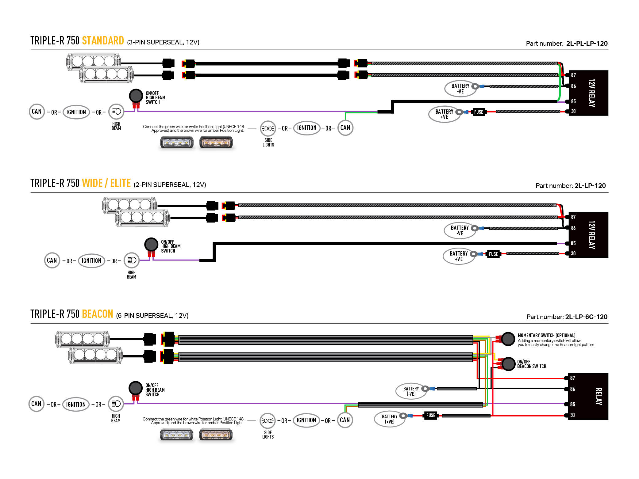 Varje kit innehåller ett par Triple-R 750 LED-extraljus med hög prestanda, tillgängliga i fyra varianter för att passa olika körbehov. Standard är en mångsidig allroundmodell med en välbalanserad ljusbild som kombinerar imponerande räckvidd och spridning, samt integrerad positionsljusfunktion. Wide ger en bredare ljusbild och har ett lägre referensvärde enligt ECE Regulation 149 – ingen effektbegränsare krävs, vilket gör den idealisk i länder med strikta ljusregler. Beacon är designad för maximal mångsidighet med integrerat gult varningsljus, positionsljus och avancerade funktioner som flash-to-dim. För maximal prestanda erbjuder Elite överlägsen optik och extra lång räckvidd för seriös körning nattetid.